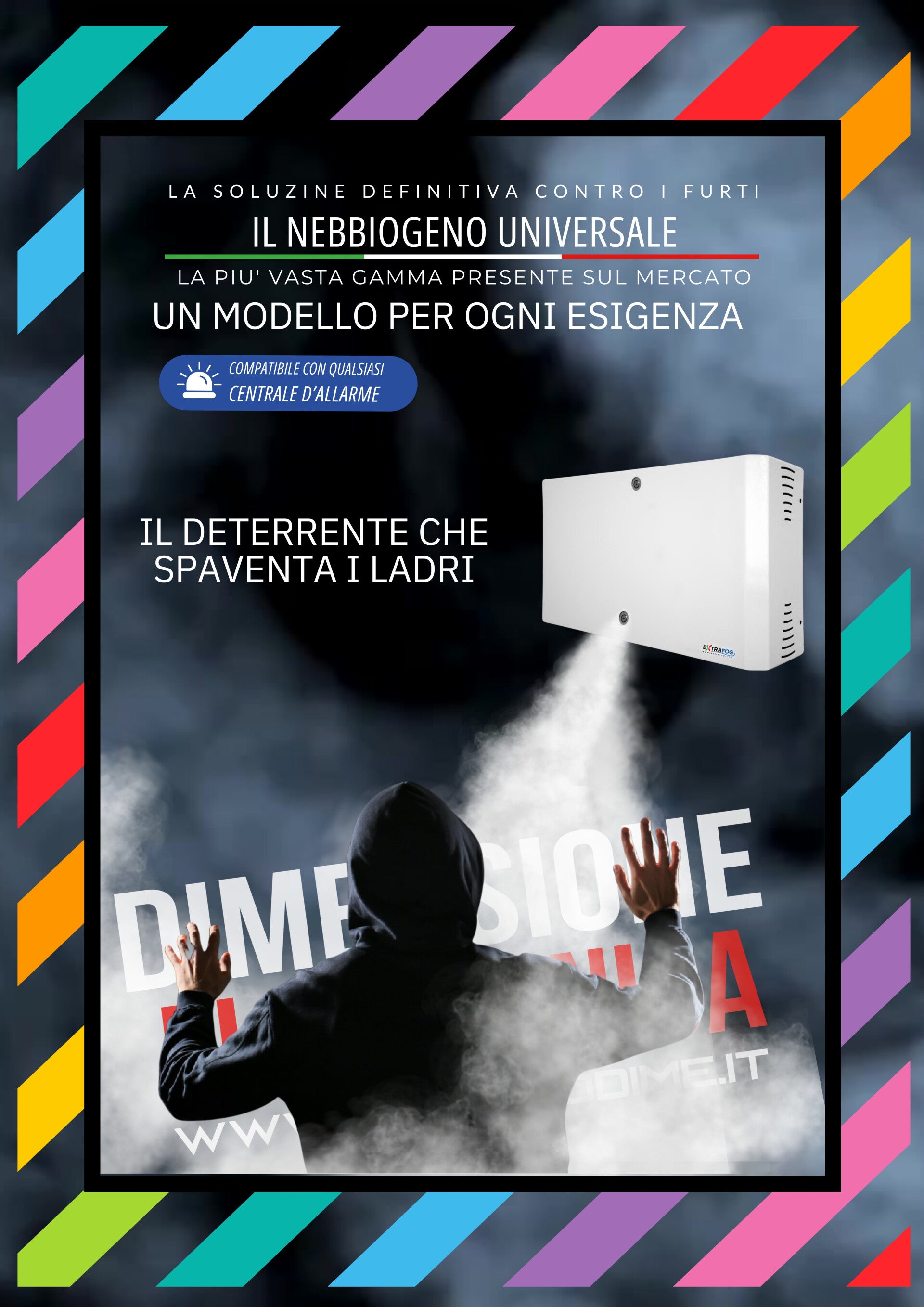 È un dispositivo di sicurezza altamente efficace che genera una nebbia densa e atossica, creando una barriera visiva impenetrabile, in grado di impedire furti e intrusioni.